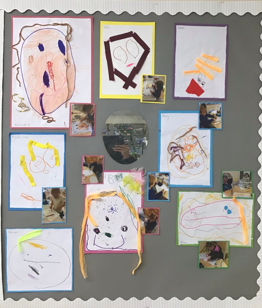 We have kickstarted our, βI like meβ learning his week by making faces from all sorts of different materials… we have made play dough faces, faces with sticks and stones, faces with collage materials and paint too! We would love to add your baby photos and family photos to our display boards so please do send them in π