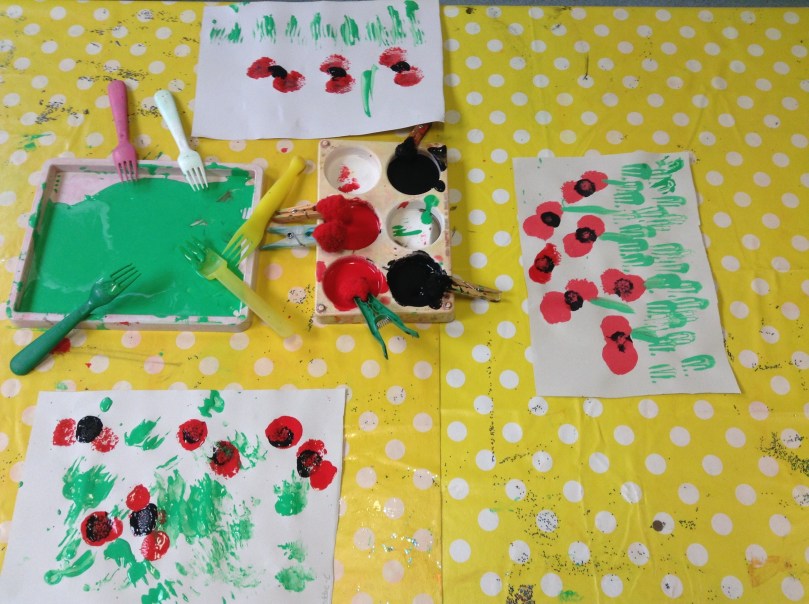 Last week on Friday we celebrated Armistice day by creating poppies in our classrooms. We also had an Autumn walk around the grounds and created leaves with natural things that we found. ![]()